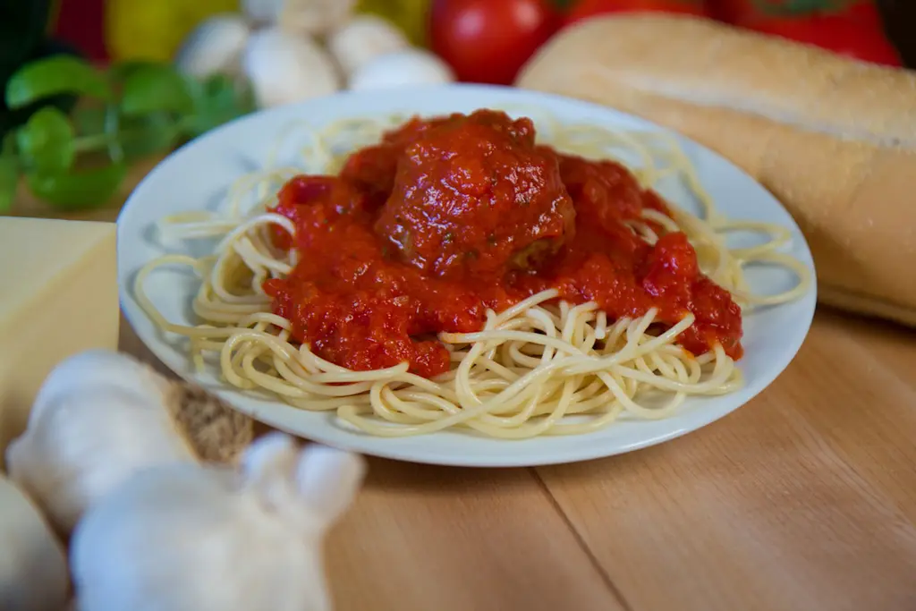 A hearty serving of spaghetti covered in a delicious sauce & topped with a meatball. Served with Garden Salad and a half loaf of garlic bread.