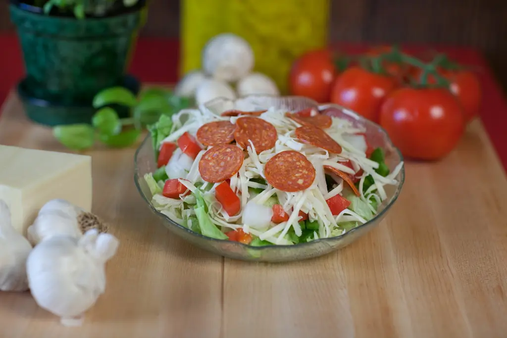 Lettuce, Tomato, Onion, Green Pepper, Pizza Cheese, Pepperoni & Crackers